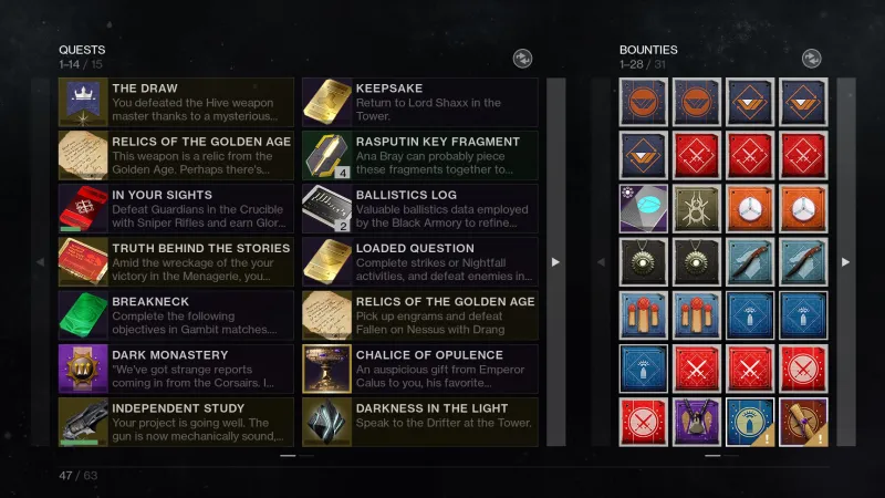 The people at Bungie behind the change were "crestfallen," about the feedback, according to Smith. "We wanted to try something different with Pursuits, in the sense that we knew where we wanted this feature to end up, but that we'd take some iterative steps to get there. I think we've got to do a better job ensuring that while we're remodeling your house, the potential of the renovation is clearer either in the game or via some communication here on the site." Smith then mentions this screen will be getting an update in the fall, separating bounties and proper quests, and letting PC players map a key to take them directly to this screen.